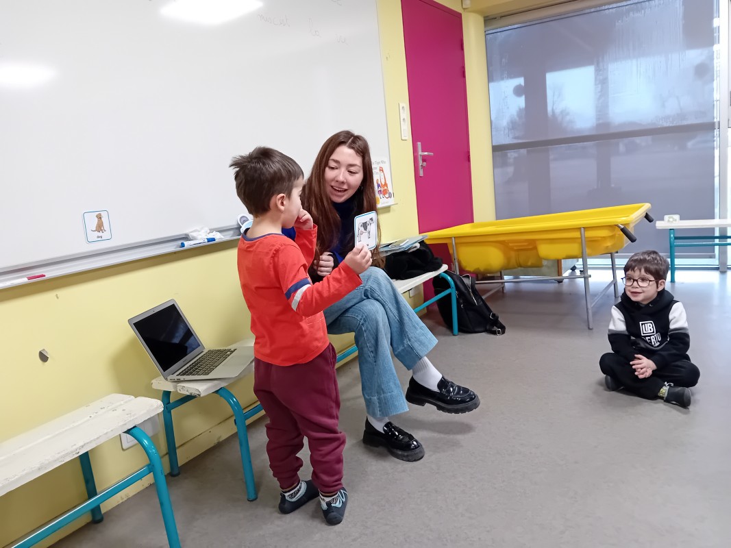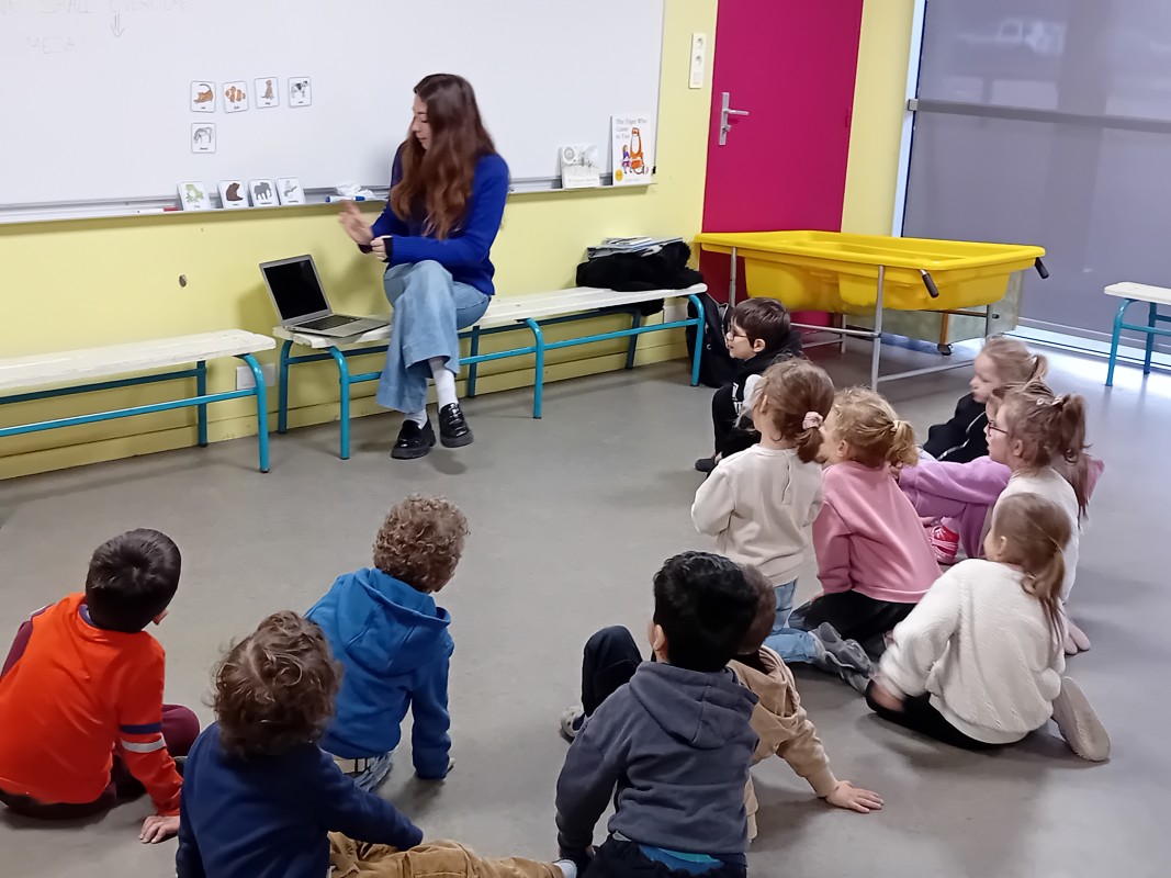 Les enfants ont participé à des petits jeux afin de mémoriser le nom de quelques animaux en anglais (pig, cat, dog, monkey, fish, horse, bear…) : retrouver l’image de l’animal placée dans la salle par Kate. (L’intervenante nomme l’animal puis l’enfant cherche l’image associée). Les élèves ont ensuite dansé sur la chanson « Baby shark »