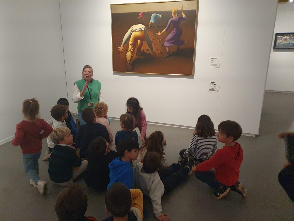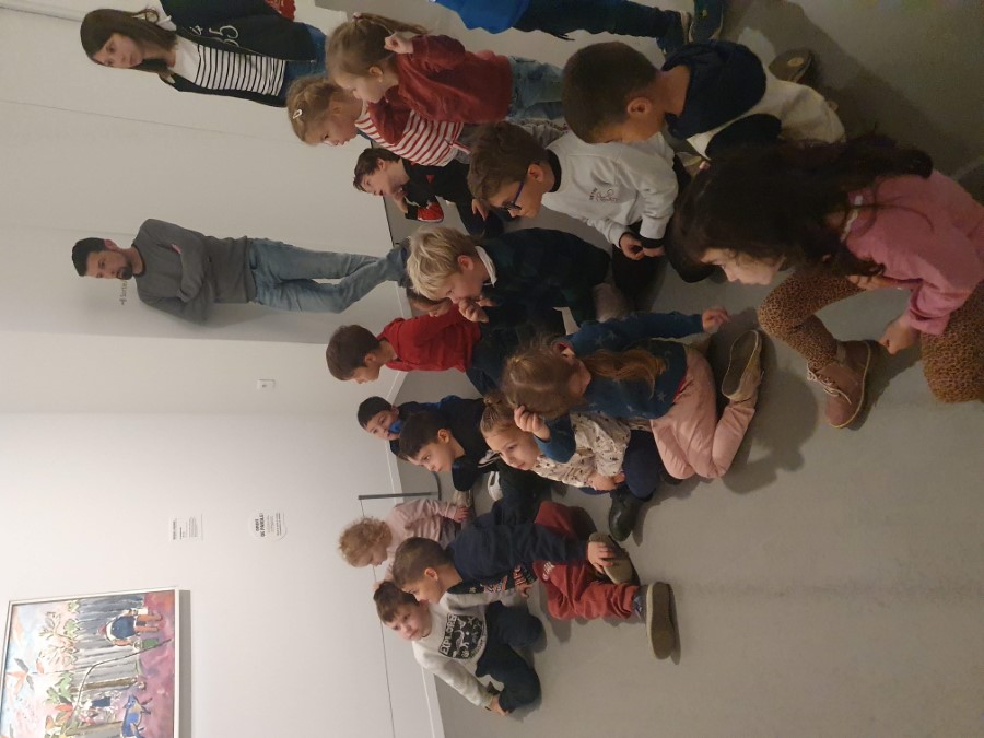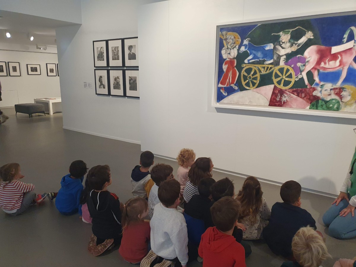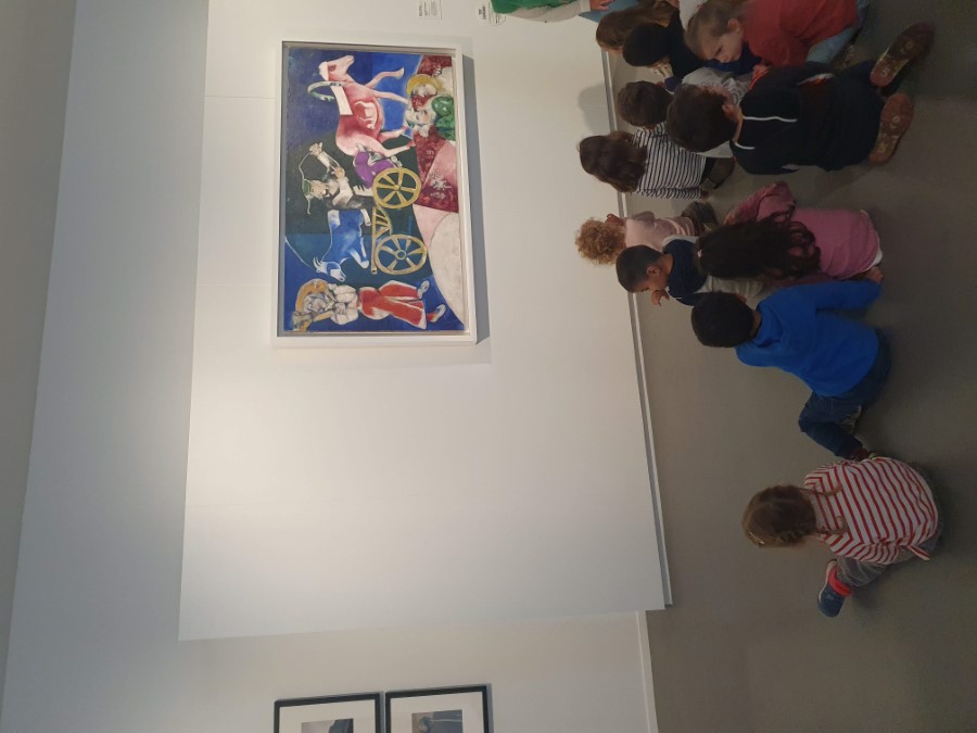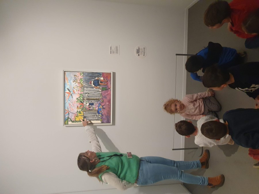 "À travers champs" explore l’univers de la ruralité à travers le regard des peintres et des photographes du XXe siècle: de Georges Braque à Joan Mitchell, en passant par Marc Chagall, Raoul Dufy, Vassily Kandinsky ou Kasimir Malevitch. Notre guide a su captiver les jeunes élèves avec des explications pertinentes sur les couleurs, les formes, les personnages, les techniques utilisées par les artistes. Au cours de la 3ème période, nous travaillerons la thématique de la ruralité en art visuel à la manière de certains artistes que nous avons pu découvrir lors de cette exposition.