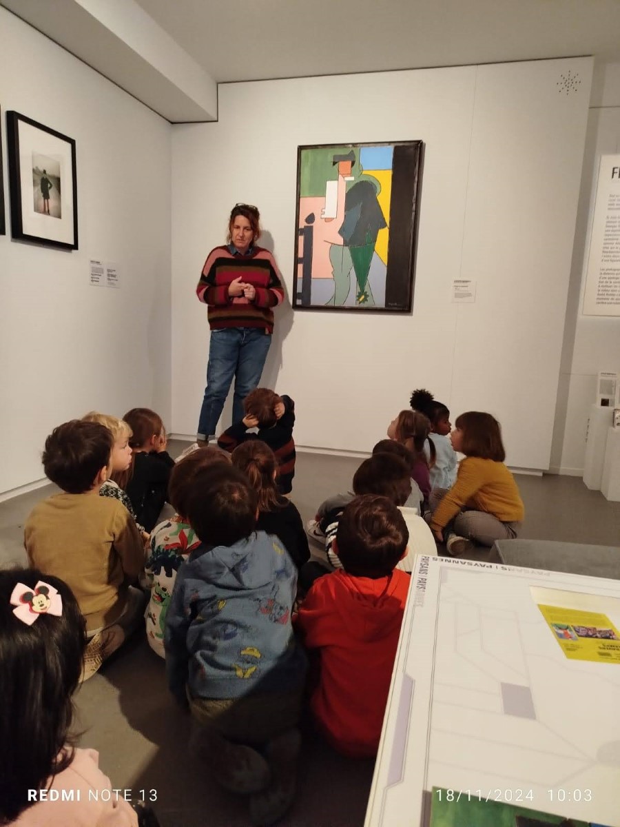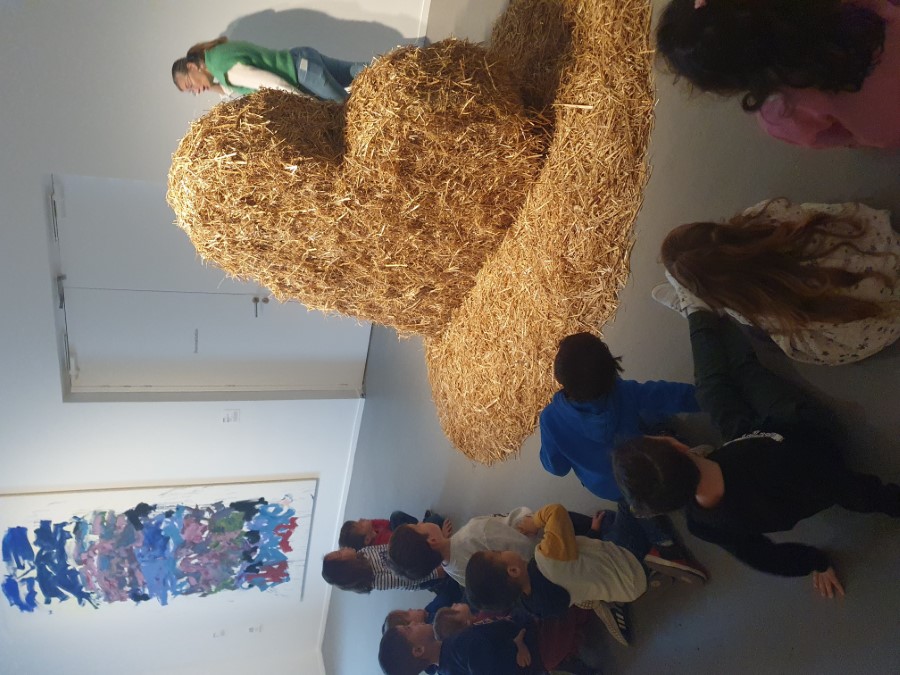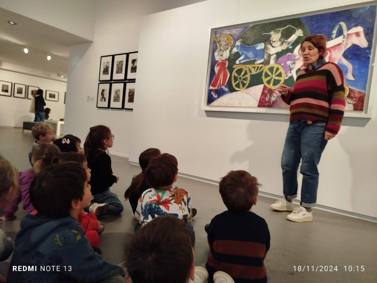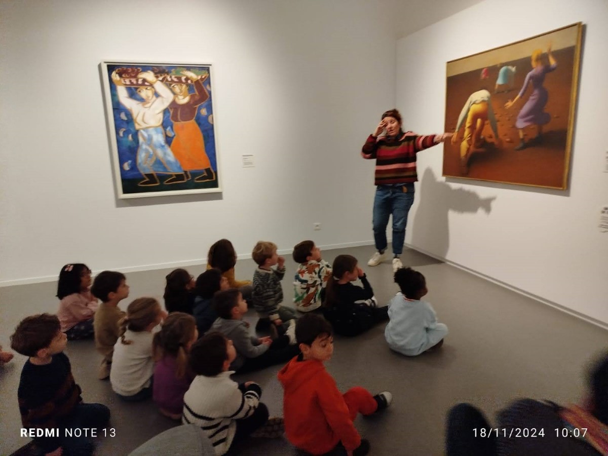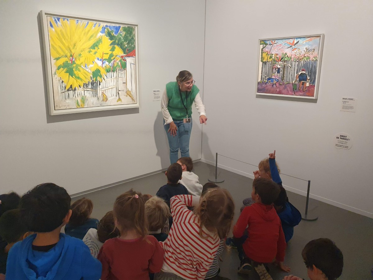 "À travers champs" explore l’univers de la ruralité à travers le regard des peintres et des photographes du XXe siècle: de Georges Braque à Joan Mitchell, en passant par Marc Chagall, Raoul Dufy, Vassily Kandinsky ou Kasimir Malevitch. Notre guide a su captiver les jeunes élèves avec des explications pertinentes sur les couleurs, les formes, les personnages, les techniques utilisées par les artistes. Au cours de la 3ème période, nous travaillerons la thématique de la ruralité en art visuel à la manière de certains artistes que nous avons pu découvrir lors de cette exposition.