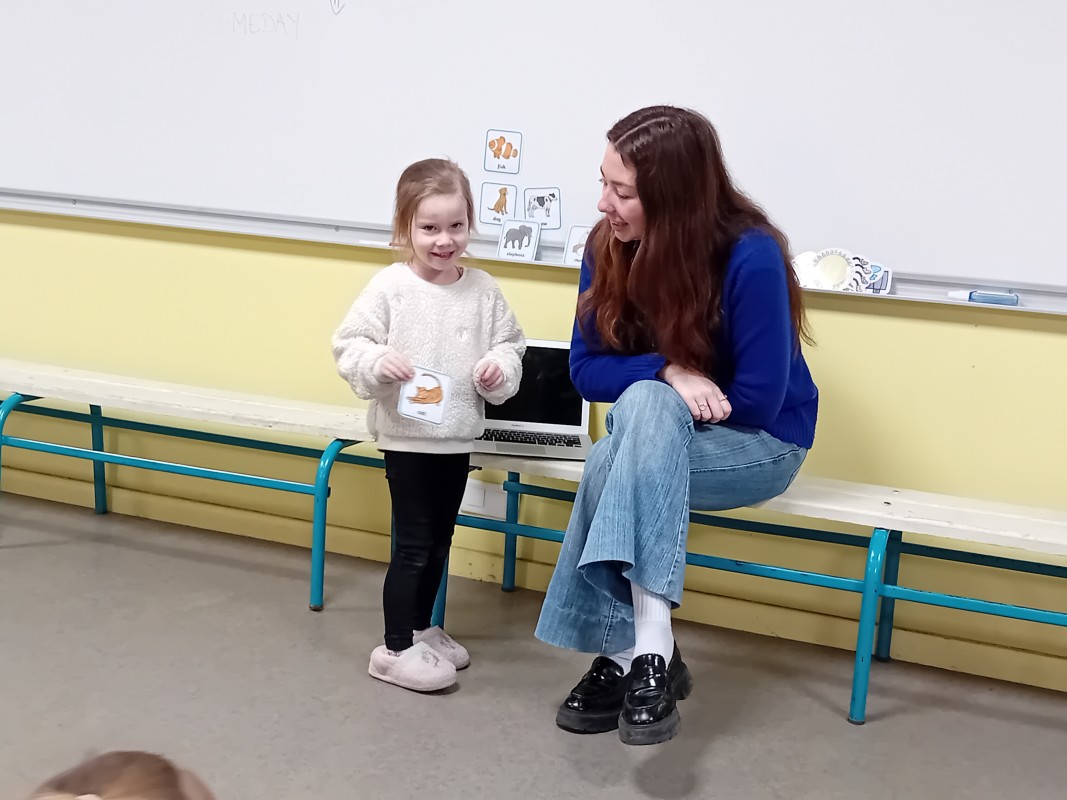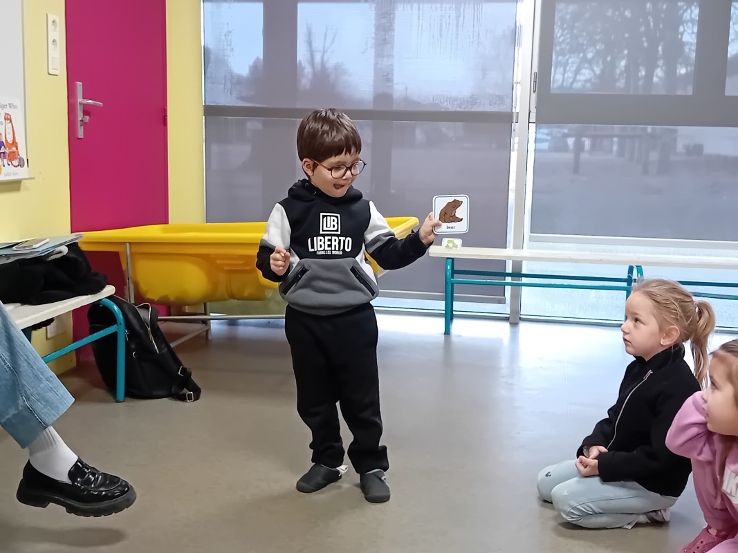 Les enfants ont participé à des petits jeux afin de mémoriser le nom de quelques animaux en anglais (pig, cat, dog, monkey, fish, horse, bear…) : retrouver l’image de l’animal placée dans la salle par Kate. (L’intervenante nomme l’animal puis l’enfant cherche l’image associée). Les élèves ont ensuite dansé sur la chanson « Baby shark »
