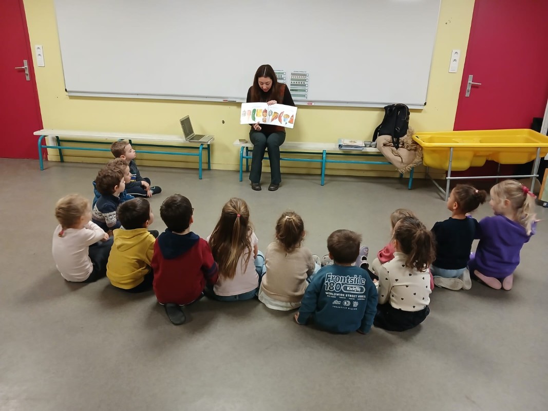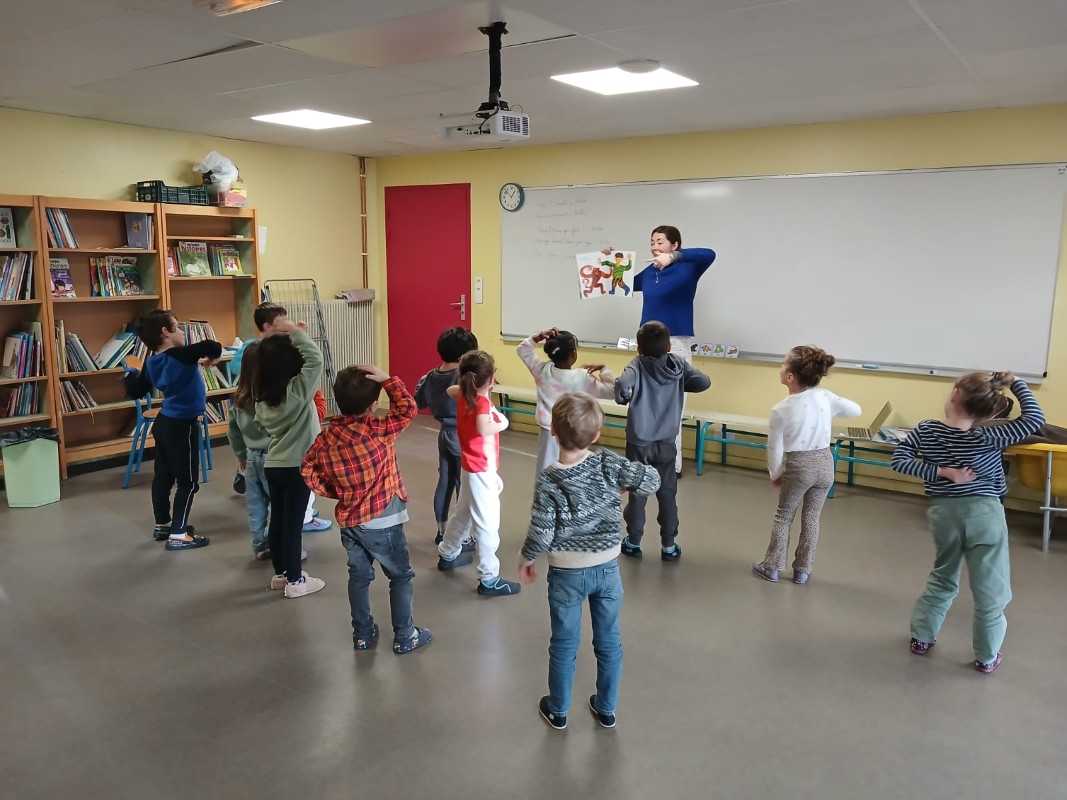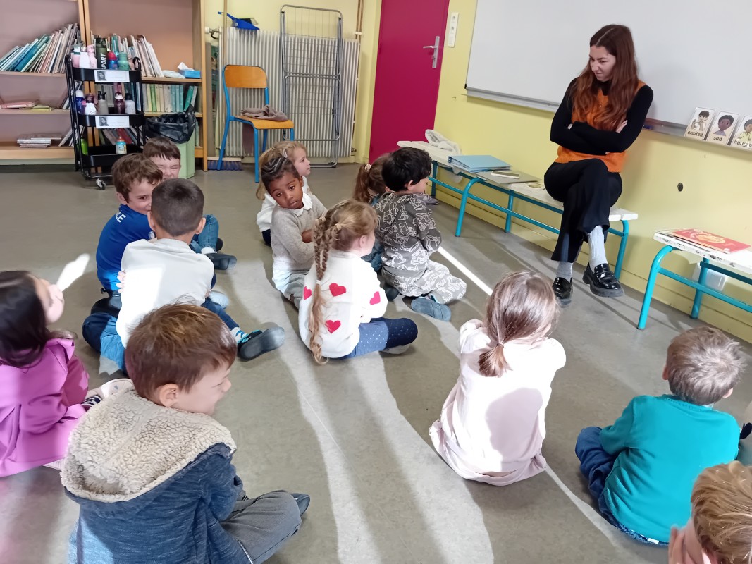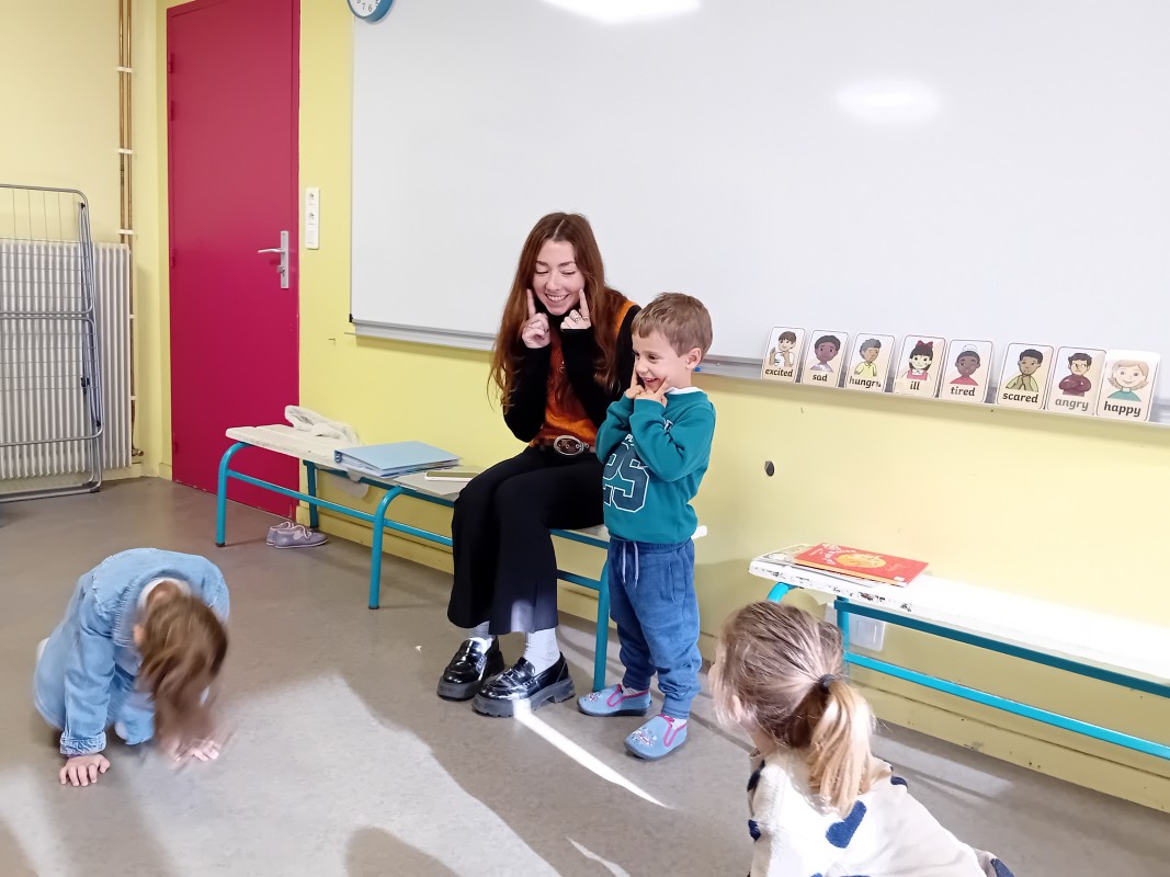 Les élèves ont participé à une séance d'immersion interactive avec Kate, une intervenante australienne, pour apprendre le vocabulaire anglais à travers les thèmes d'Halloween, des émotions, des animaux et de Noël.