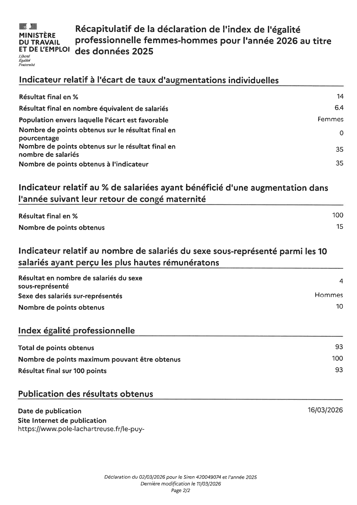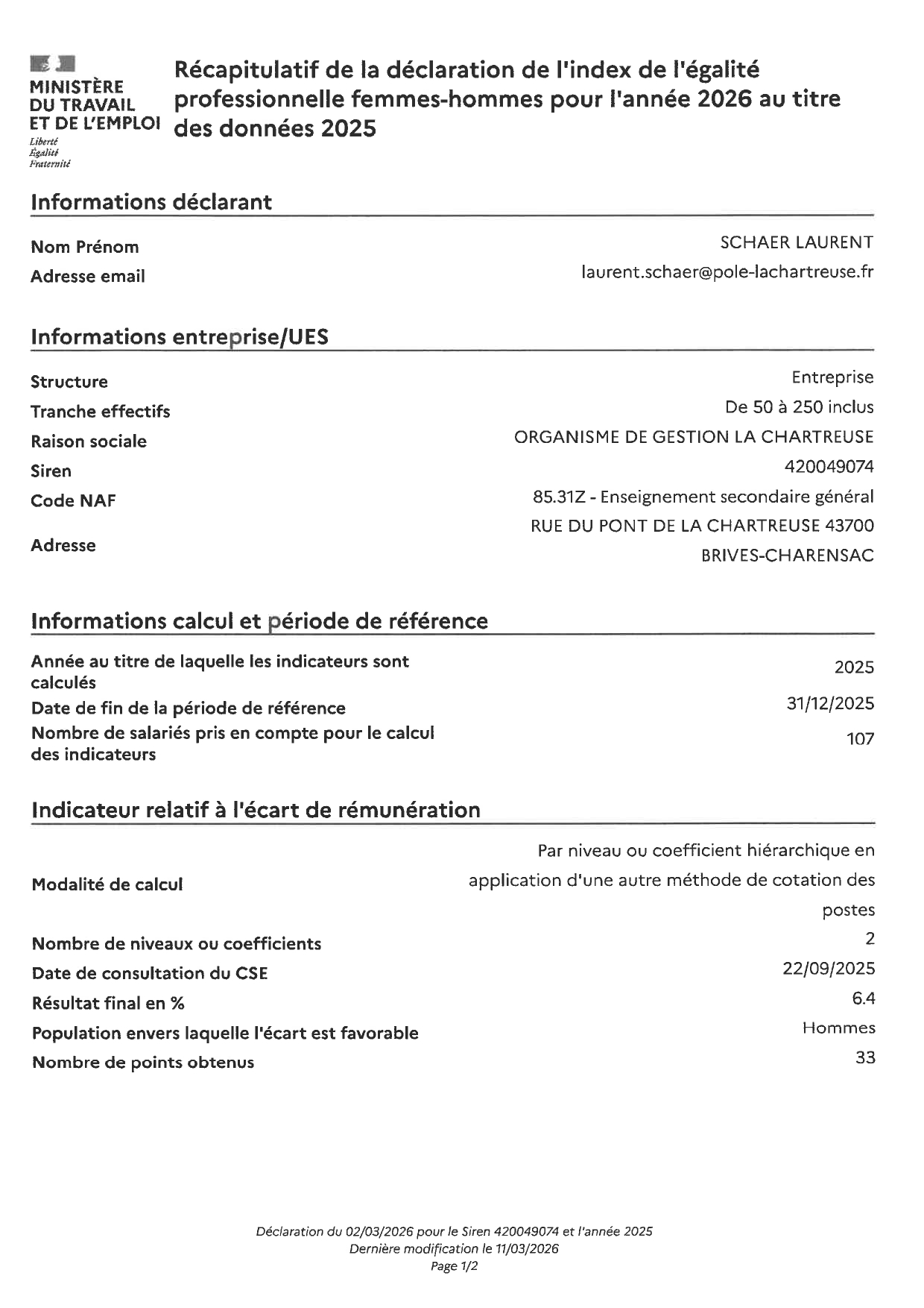 Dans les entreprises d'au moins 50 salariés, l’employeur a l’obligation de communiquer sur son site internet les résultats de l’index de l’égalité femmes-hommes et des indicateurs qui la composent. Voici ceux de l'OGEC La Chartreuse.