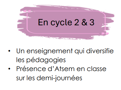 Anglais dès la maternelle sous forme de jeux, comptines, sport avec le concours d'une assistante anglophone. Décloisonnement en demi-groupe pour l'enseignement de l'anglais en primaire.